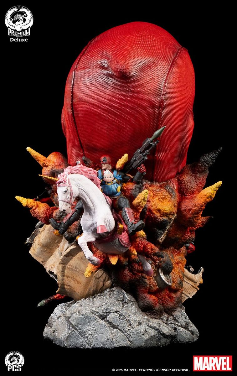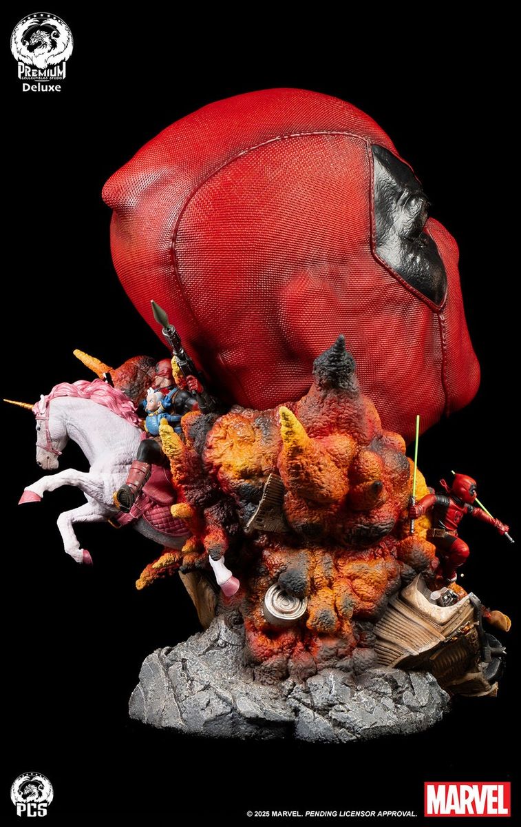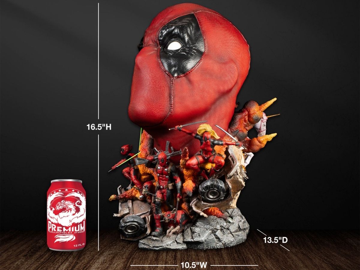 16,5 inç boyunda ve 10,5 inç genişliğinde olan bu benzersiz güzel sanat eseri, Deadpool ve bazı çevrelerde Deadpool Kolordusu olarak bilinen yandaşlarının kaotik dünyasını gösteren aksiyon dolu 360 derecelik bir sahnedir.