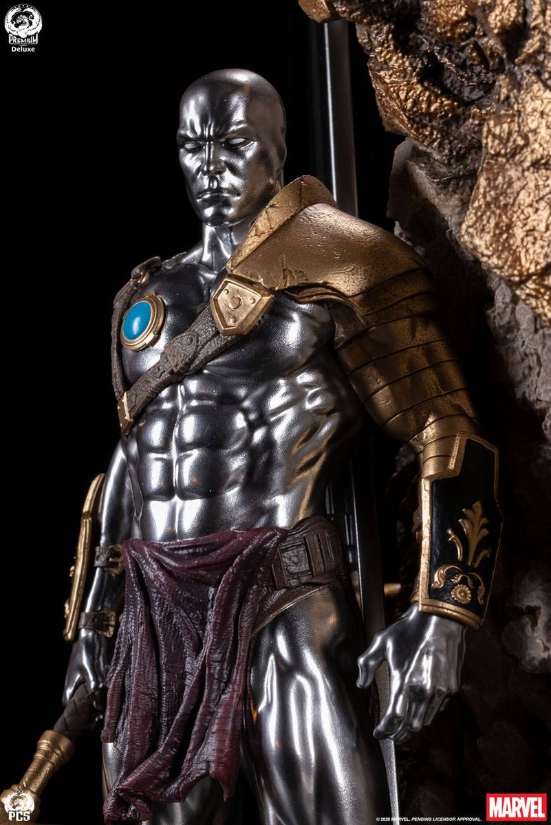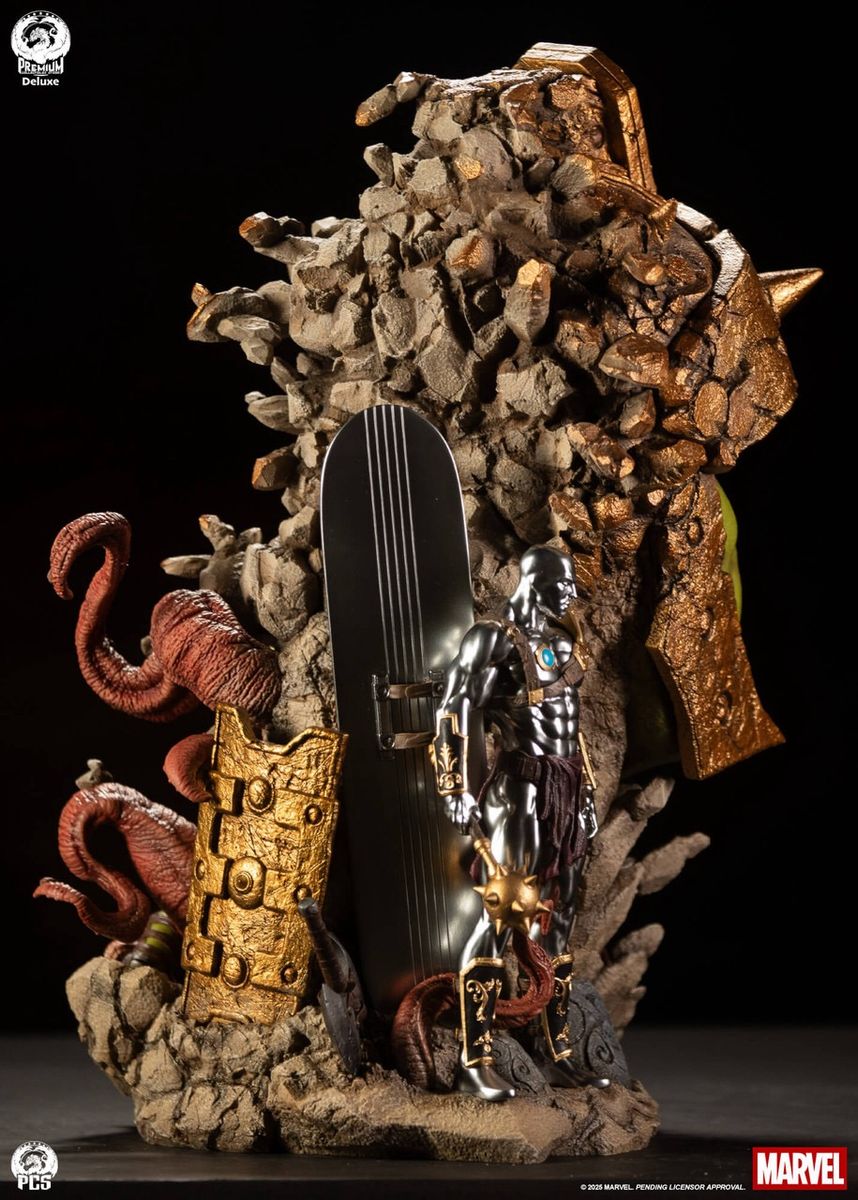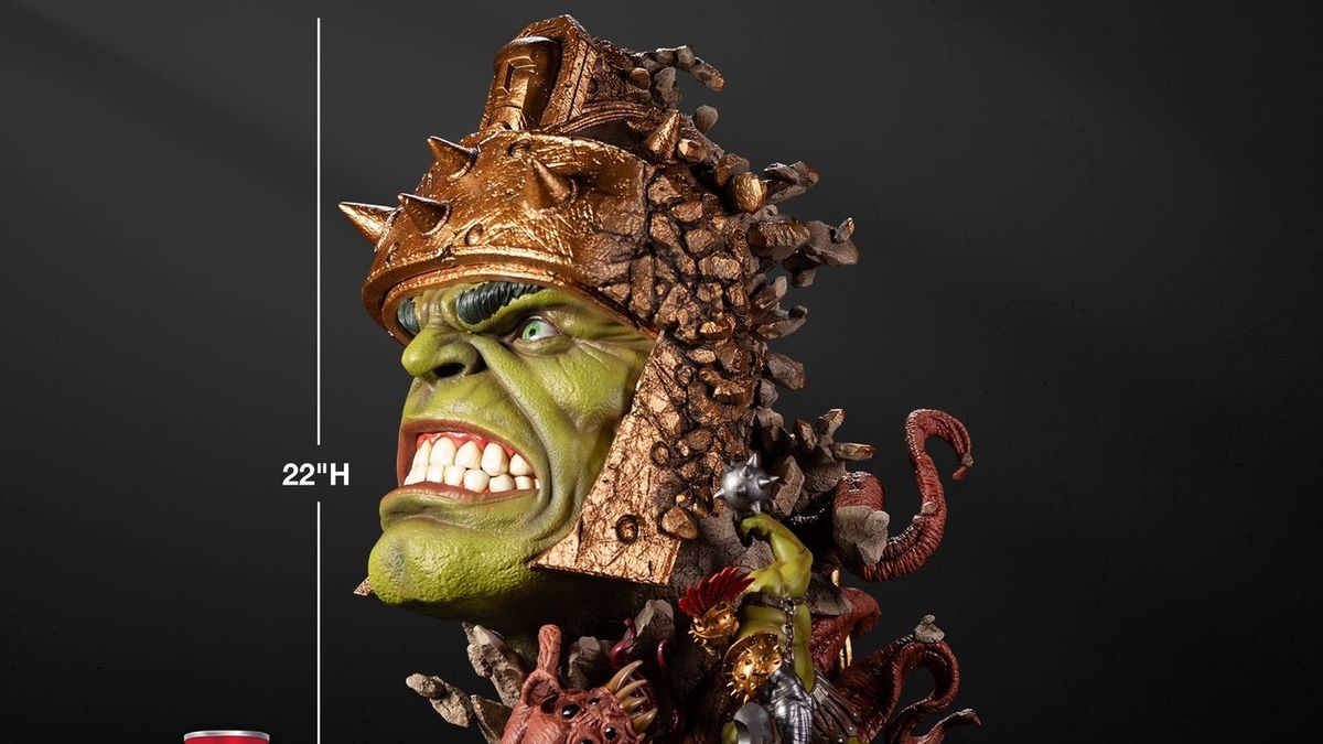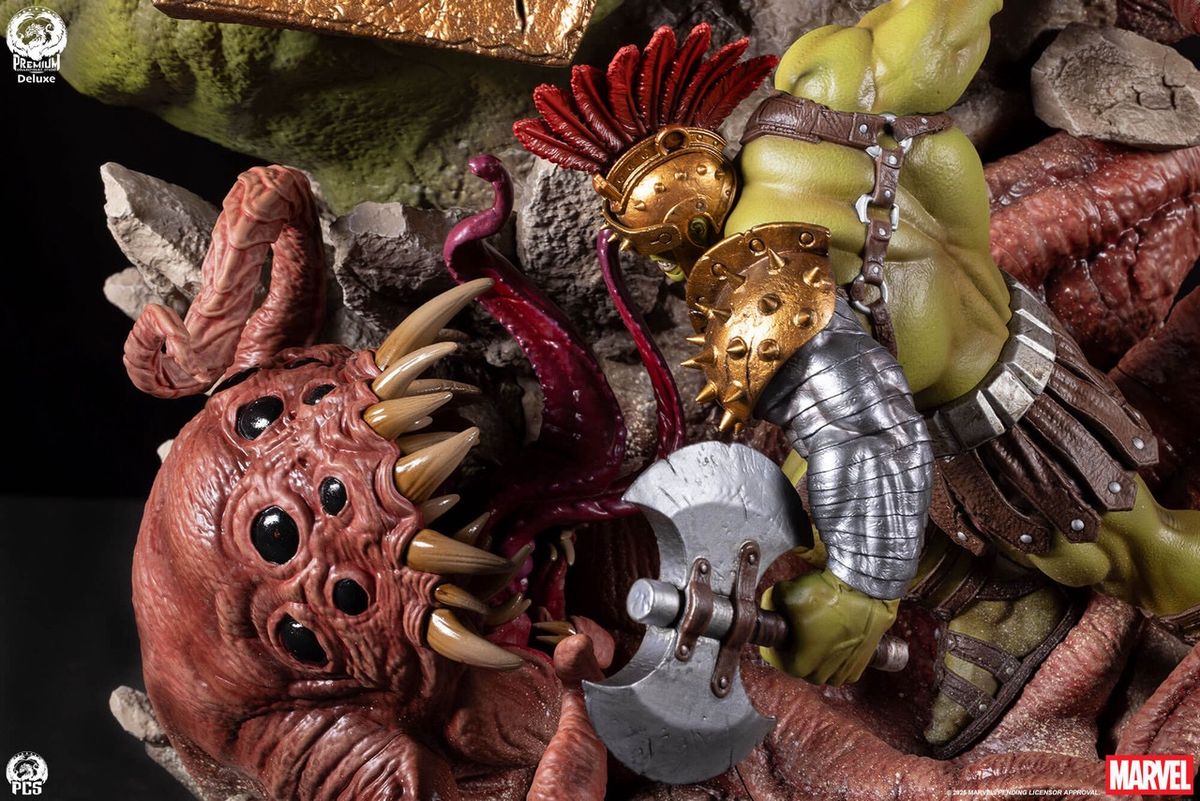 55 cm yüksekliğindeki bu benzersiz koleksiyon parçası, yerinden edilmiş kahramanın öfkeli bir portresine odaklanıyor ve ardından yavaş yavaş savaş dünyası Sakaar'ın sert yüzeyini anımsatan kayalık bir yüzeye dönüşüyor. Portrenin etrafında, ağır zırhlı Hulk'un vahşi bir "Şeytan Corker", muhteşem detaylara sahip ve tamamen zırhlı bir Vahşi Sörfçü ile mücadele ettiği bir sahne ve ikonik gladyatör mücadelesinde kullanılan çeşitli silah ve zırhlar yer alıyor.
