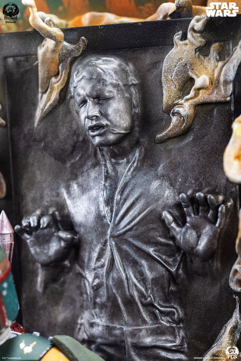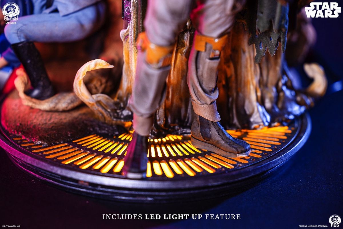 Boba Fett - Fine Art Büst Deluxe Edition, zaten baş döndürücü olan bu parçaya ekstra bir heyecan ve drama katmak için LED ışık özelliklerine sahip. Karbonit dondurma odasının zemininin altından yayılan sıcak parıltı, bu parçanın öne çıkan bir parçası olan bir heykeli aydınlatıyor. Rahatsız edici derecede metanetli Boba Fett, donmuş avının yanında duruyor.