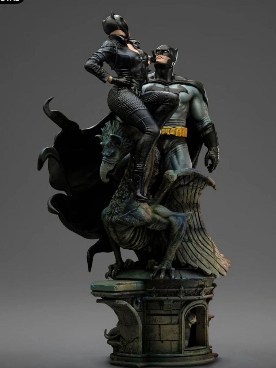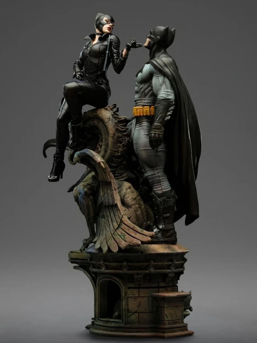 Süslü taş yaratığın ayaklarının dibinde, kahraman, büyüleyici güçle yüzleşirken tipik soğukluğunu ve katı tavrını korumaya çalışır, ancak bunu başaramaz. Siyah pelerini çırpınarak ve büyük yarasa kanatlarını taklit ederek, Iron Studios, DC Comics'in Batman ve Catwoman'ını orijinal referanslara dayanarak elle boyanmış detaylarla hayata geçiriyor.