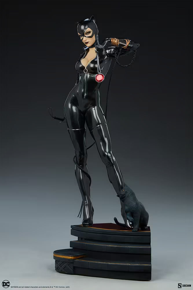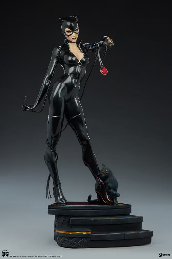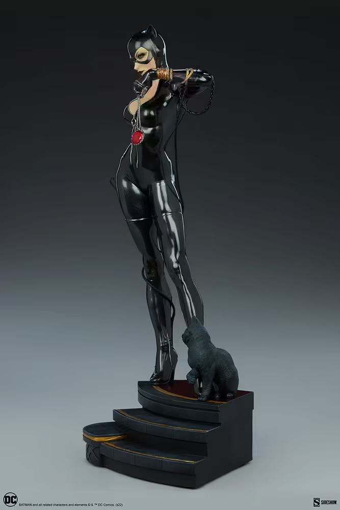 Sorun ne — kedi sizin yeri doldurulamaz mücevherlerinizi mi aldı? Catwoman Premium Format Figürü, Selina Kyle'ın Wayne Malikanesi'nin basamaklarında son çaldığı hazineleri tutarken 21" boyunda ve 10" genişliğindedir: paha biçilmez bir yakut kolye ve Bruce'un kasasından bir dizi altın bilezik. Bir kedi arkadaşı, kedi hırsızı ganimetini çalmaya hazırlanırken, onun kırbacı omuzlarına doğru sarkarken, bir kuyruk gibi kıvrılarak ayak bileğine sokulur.