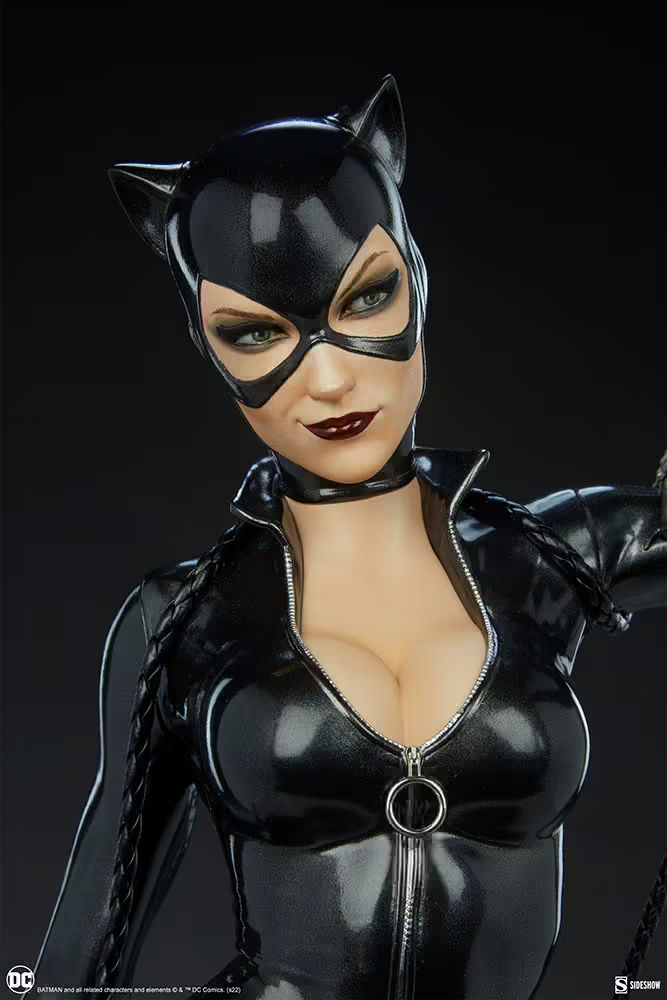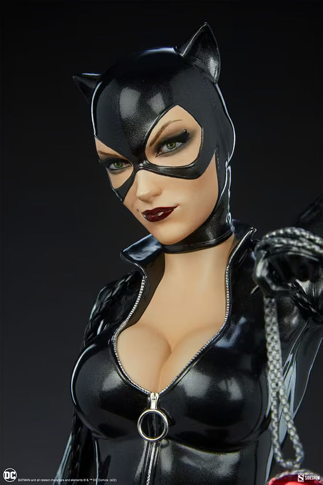 DC Comics'teki görünümünden ilham alan Catwoman Premium Format Figürü, catsuit kumaşının şık, parlak dokusunu taklit etmek için parlak siyaha boyanmış, tamamen şekillendirilmiş bir kostüme sahiptir. Gümüş fermuar detayları gizli kostüme hoş bir vurgu katar ve Selina'nın kedi kulaklı başlığı, onun şehvetli ifadesini mükemmel bir şekilde çerçeveler. Topuklu çizmeleri kostümünün yansıtıcı özelliğini ve Wayne Malikanesi'nin yemyeşil kırmızı zeminini vurgulamak için kırmızı tonlarında vurgularla boyanmıştır.