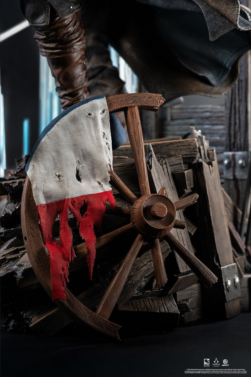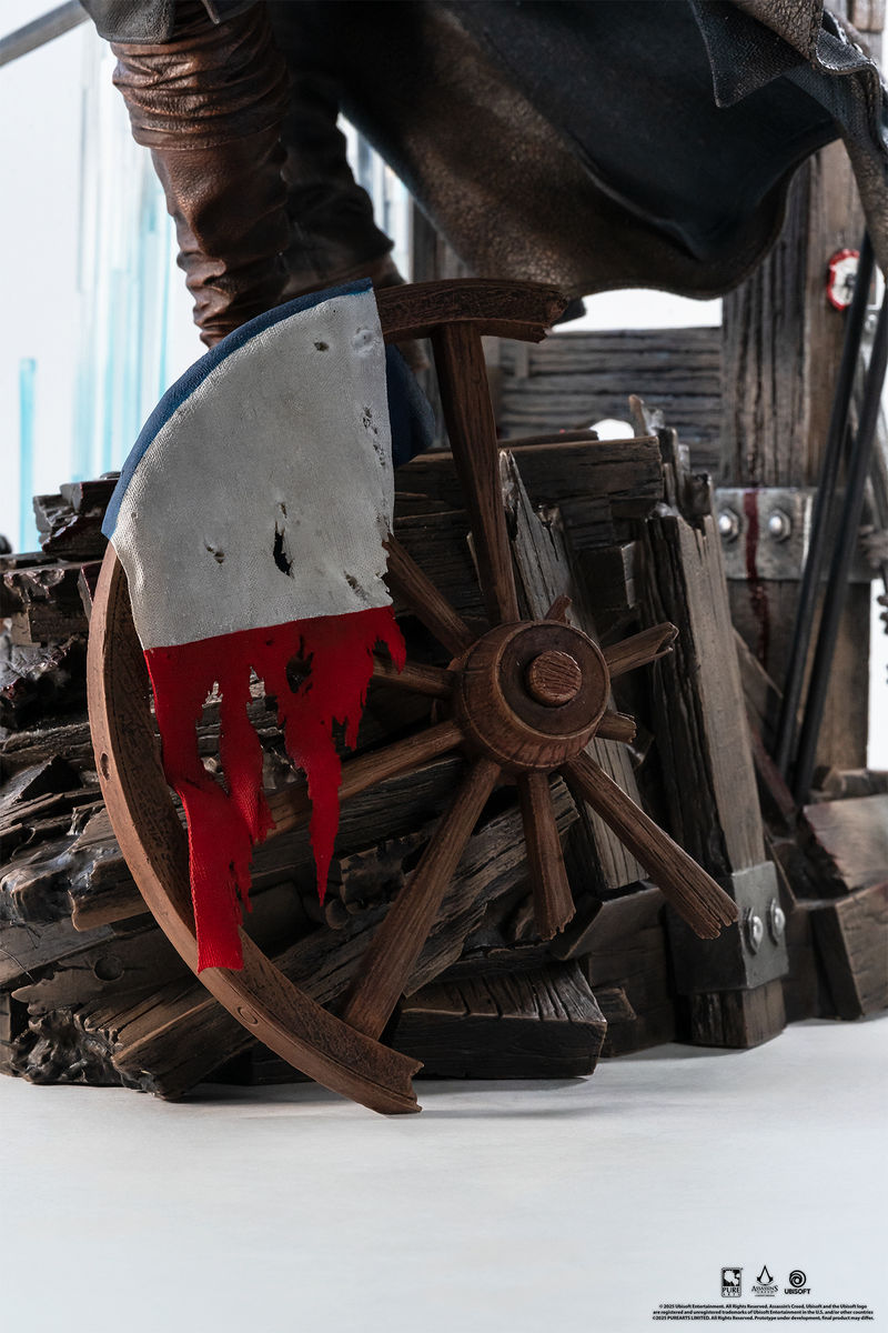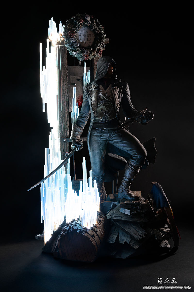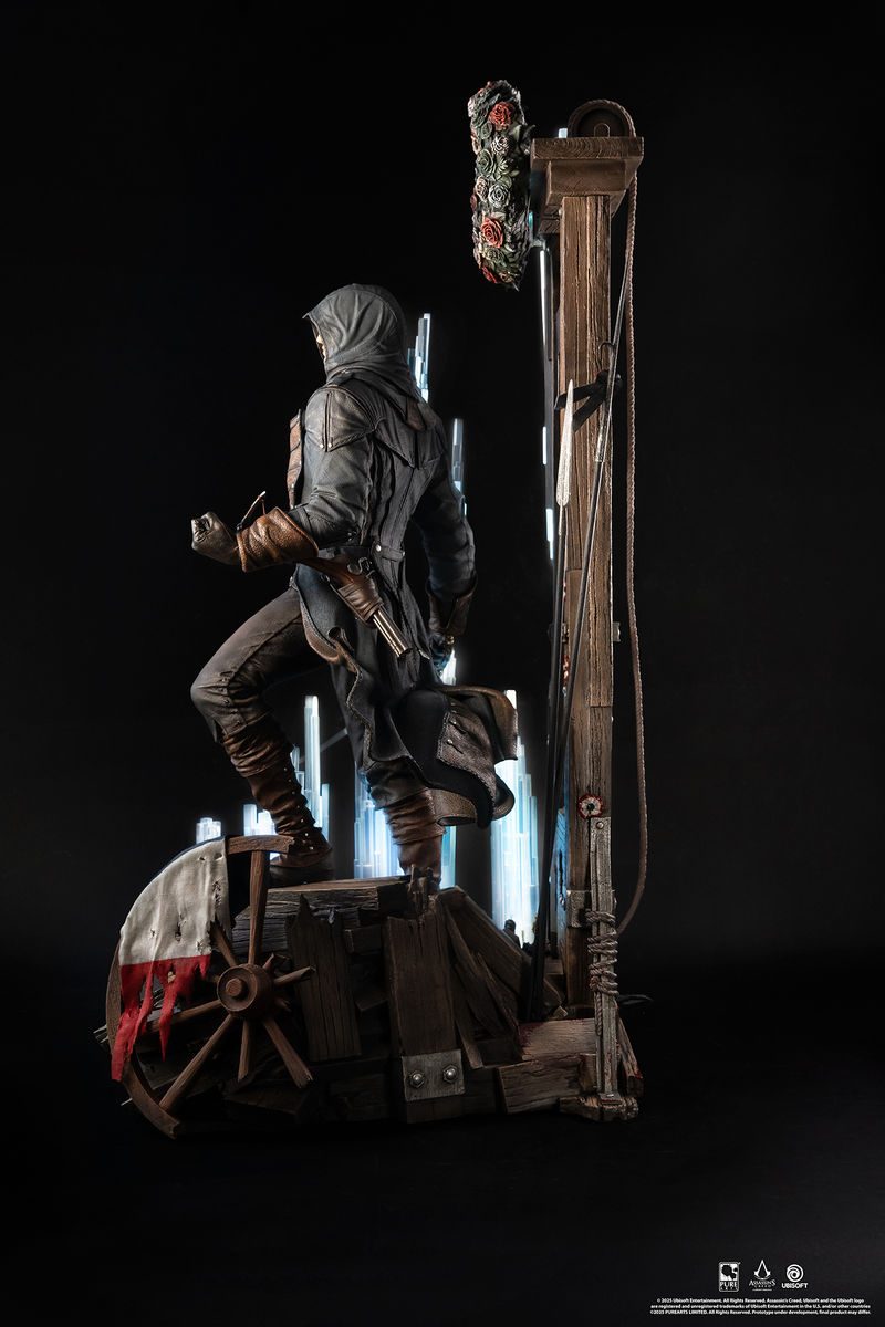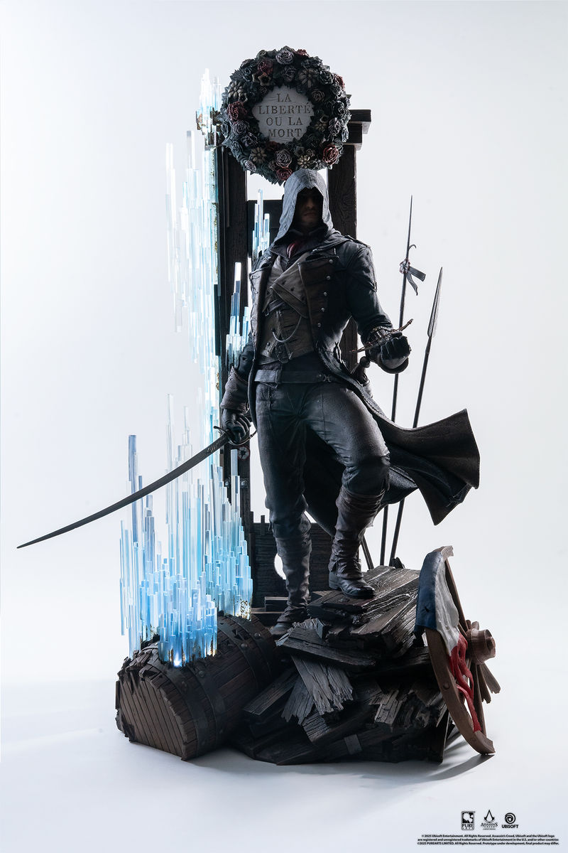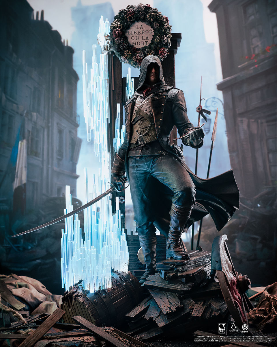 Assassin's Creed Unity'nin baş kahramanı Usta Suikastçı Arno Dorian ile birlikte Fransız Devrimi'nin kalbine adım atın. Arno, bir elinde kılıcı, diğer elinde hayalet bıçaklı tatar yayı ile ayaklanmanın enkazının ve kalıntılarının üzerinde duruyor. Arno'nun arkasında, üzerinde meydan okuyan "Özgürlük ya da ölüm" yazısı bulunan bir çiçek çelengiyle taçlandırılmış, yıpranmış bir giyotin yükseliyor. Ayaklarının dibindeki yıkıntıların arasında, Devrim'in kaosunu yansıtan yırtık bir Fransız bayrağı uzanıyor. PureArts'ın imzası olan LED aydınlatmalı Animus efekti sağ tarafından belirerek çalkantılı sahneyi aydınlatıyor.