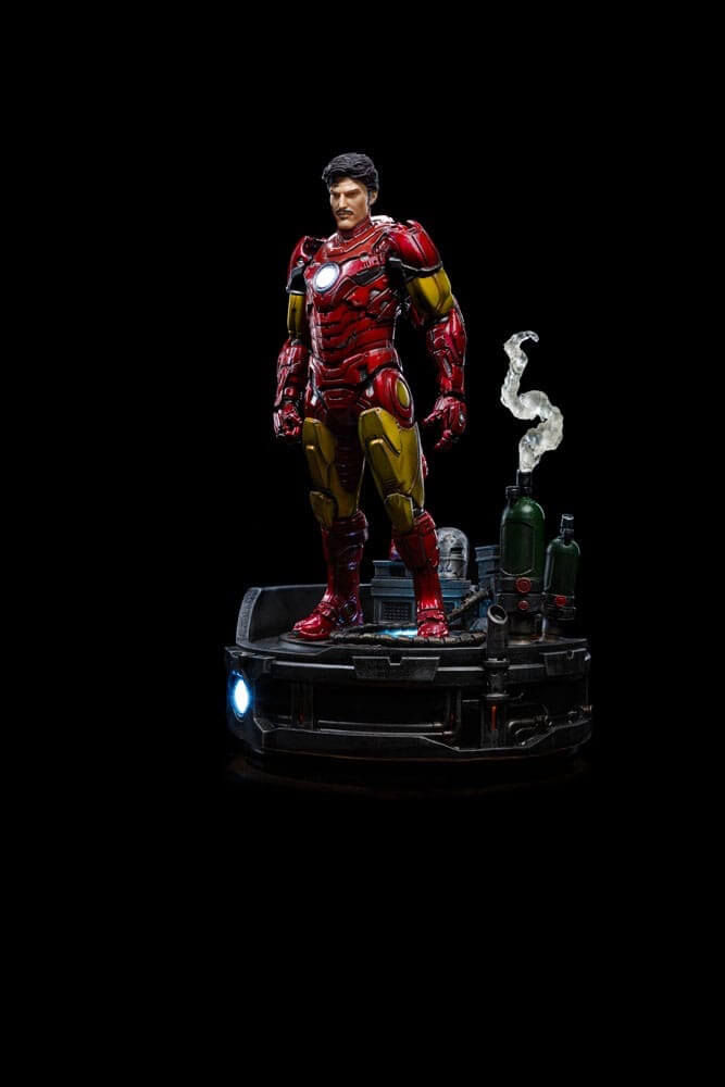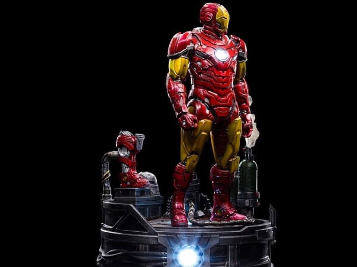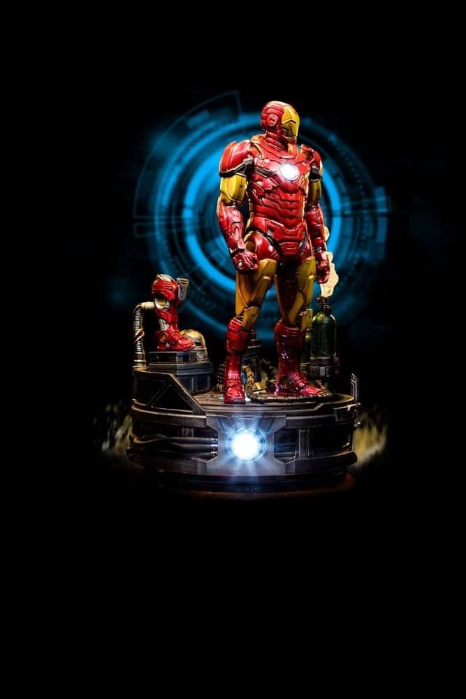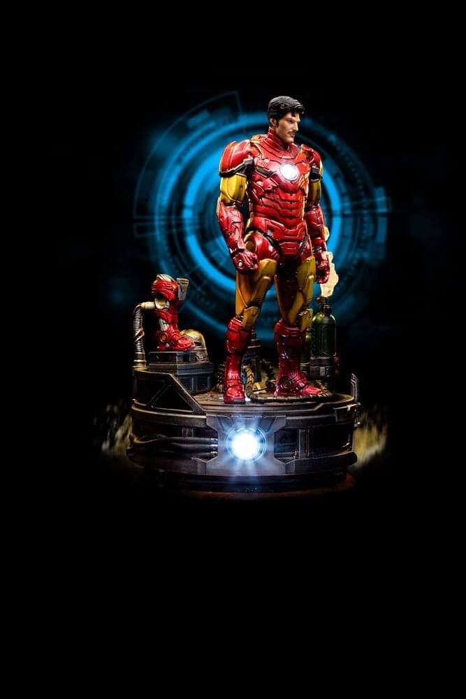 Çizgi romanlardaki köklerinden ve beyaz perdedeki dünya çapında popüler ve övgü toplayan varlığından ilham alan kırmızı ve altın zırhıyla mükemmel bir uyum yakalayan zırhlı intikamcı, detaylar ve referanslarla dolu bir teknolojik temel üzerinde kendini gösteriyor. Stark Industries logosuyla tanımlanan gaz silindirleri, yanında yeni bir zırhın prototip botu, orijinal zırhlı miğferi, geçmişi ve bugünüyle kontrast oluşturuyor. Diorama setinin bir parçası olarak bir Ark reaktörüyle tamamlanan Iron Studios, kahramanın alter egosunu gösteren miğferi olmayan ekstra bir başını da içeren Iron Man Unleashed heykelini gururla sunuyor.