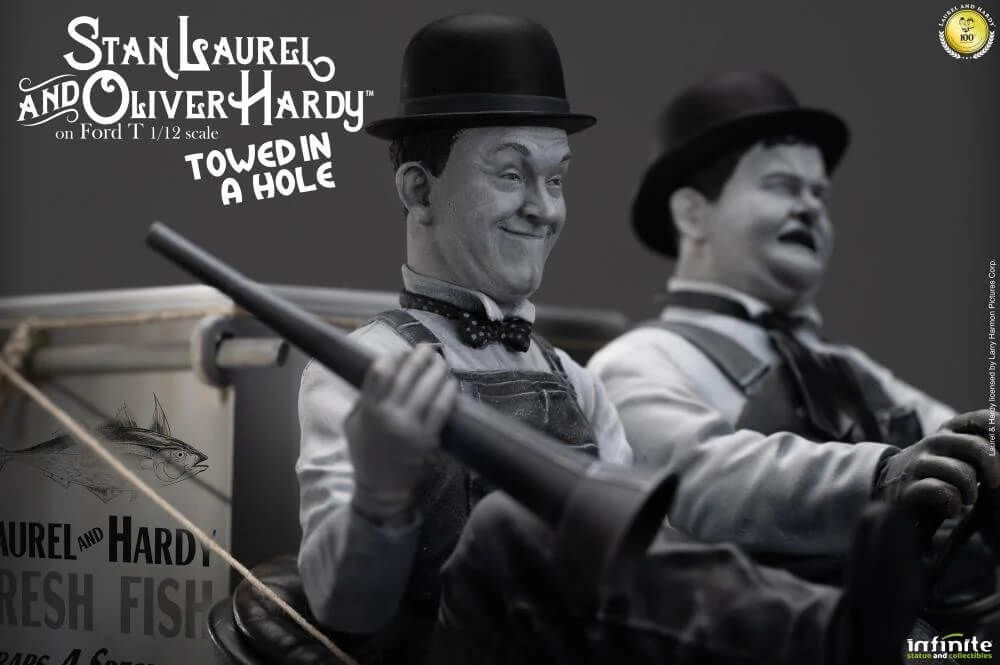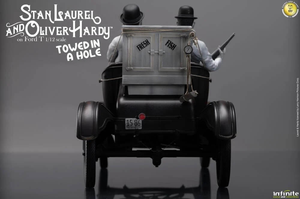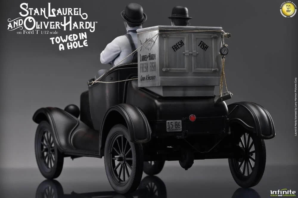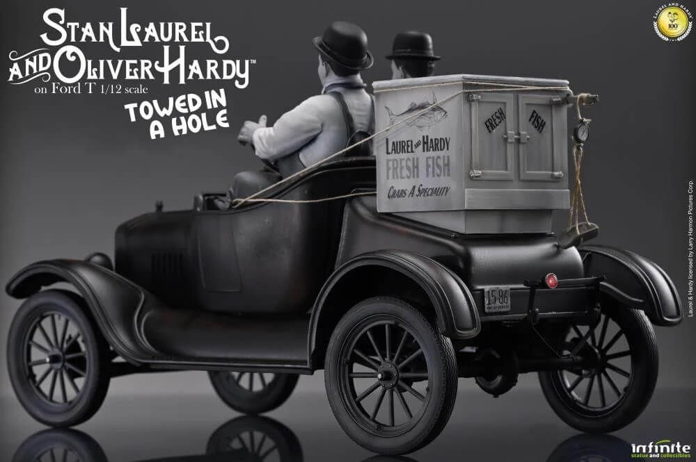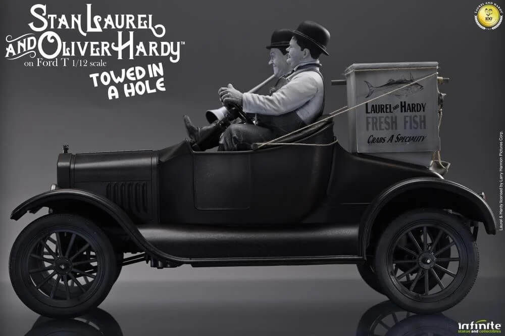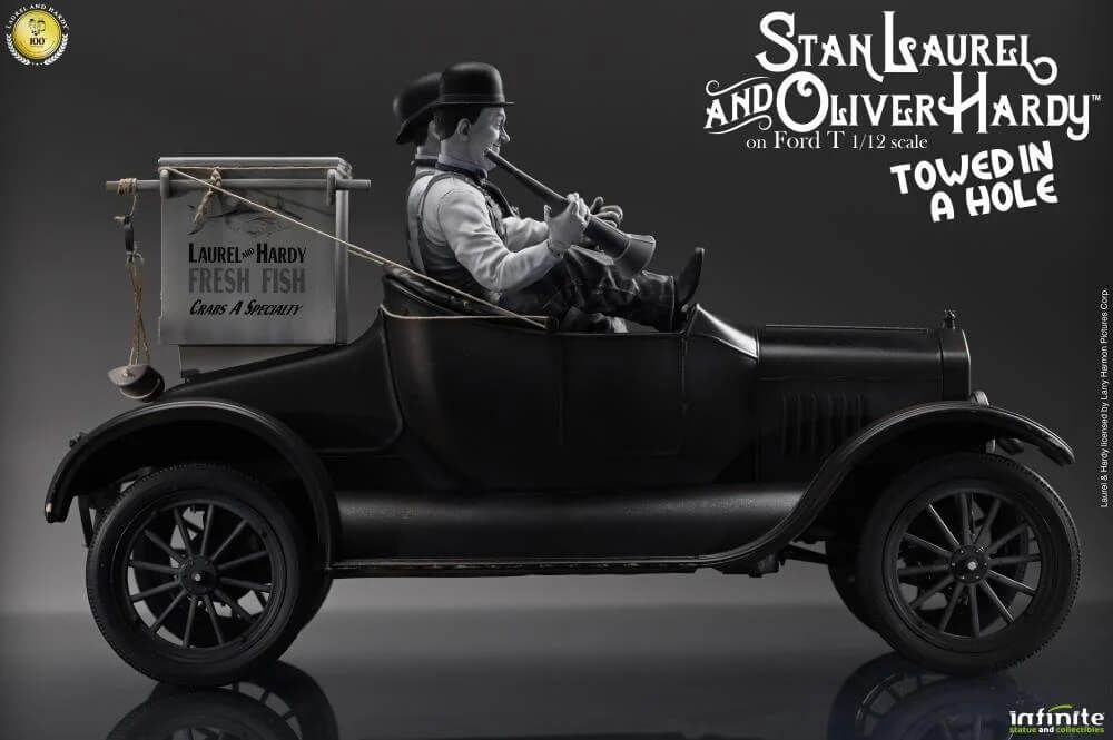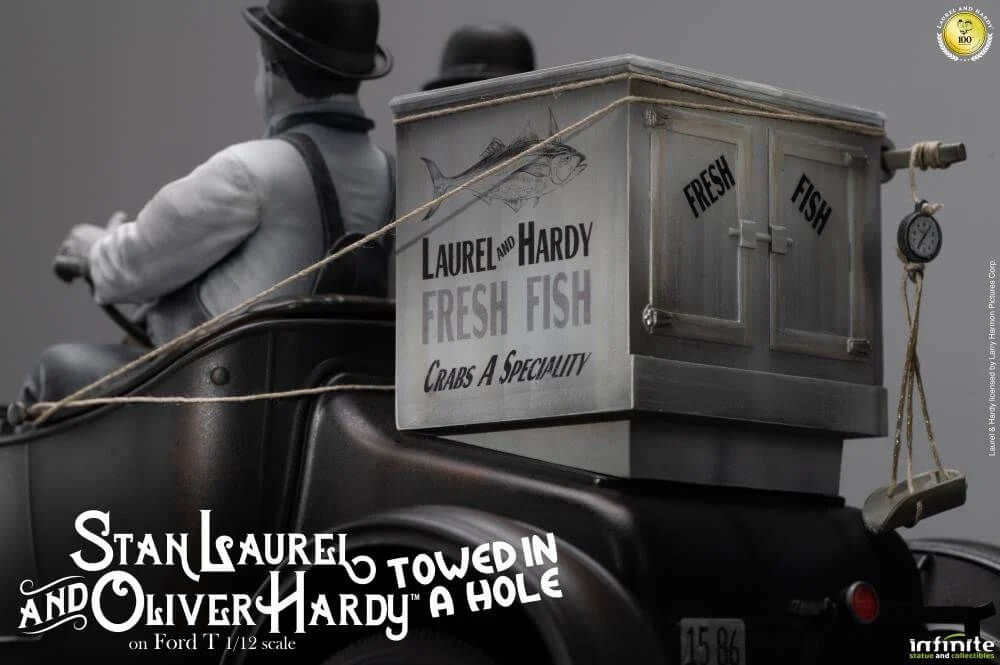 Stan Laurel ve Oliver Hardy'ye adanmış, 1932 yapımı klasik kısa film "Towed in a Hole"dan esinlenen yeni 1/12 ölçekli koleksiyonluk heykel. Sahnede, ikonik ikili, kapı kapı balık satışlarında kullanılan modifiye edilmiş Ford Model T'leriyle, kasalar, aletler ve incelikle işlenmiş aksesuarlarla çevrili halde görülüyor.