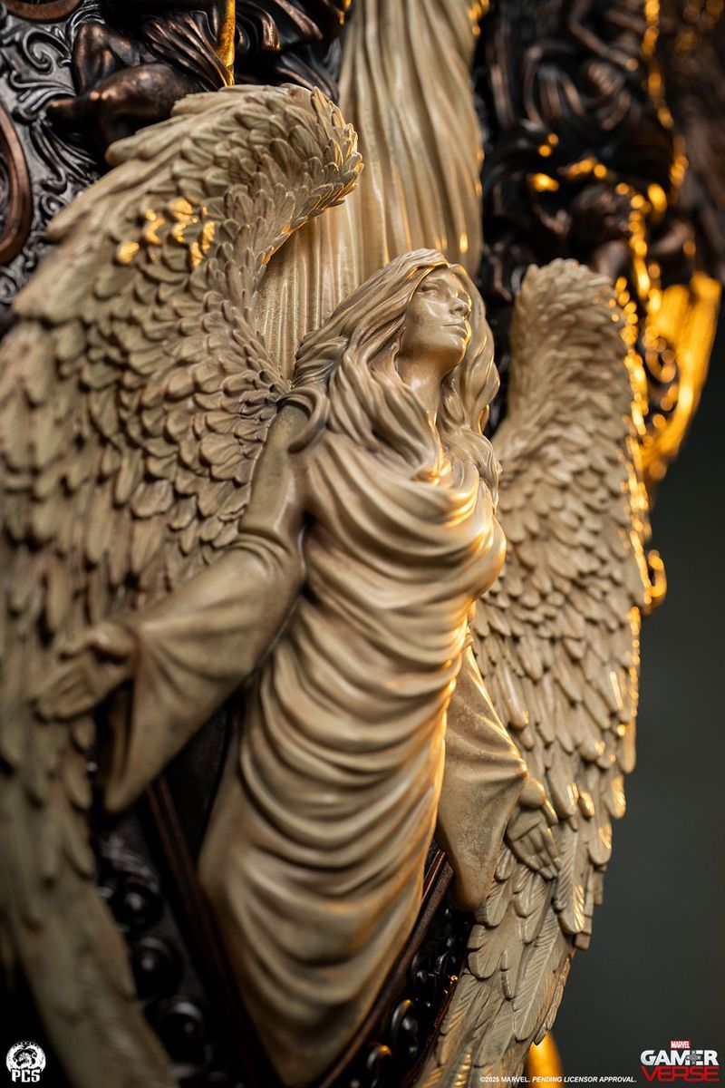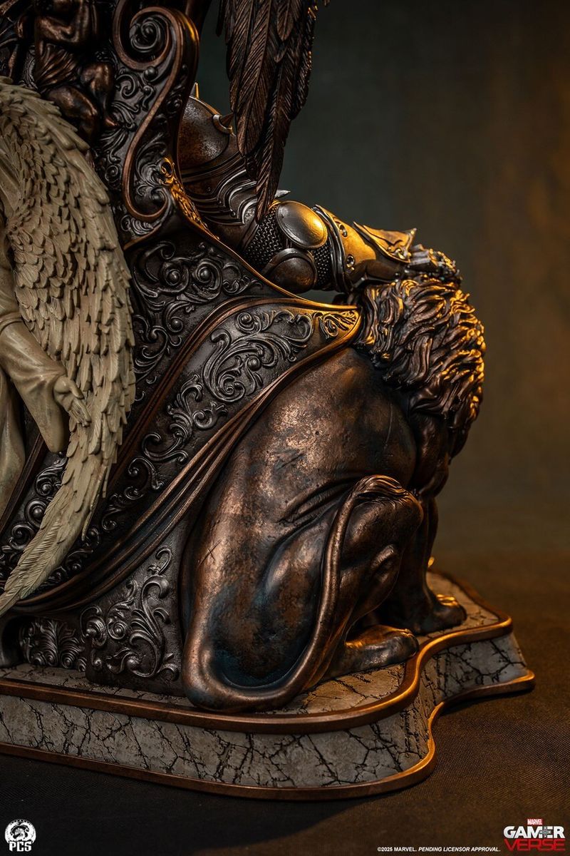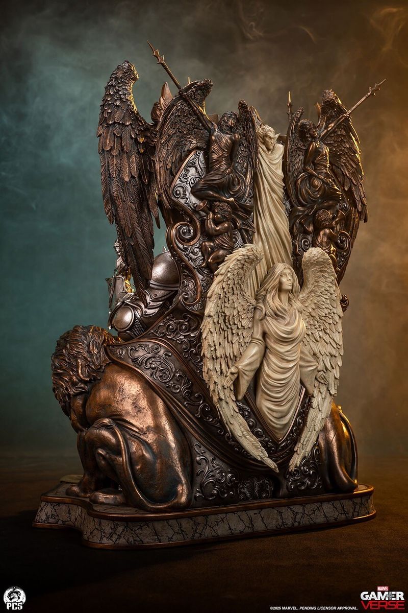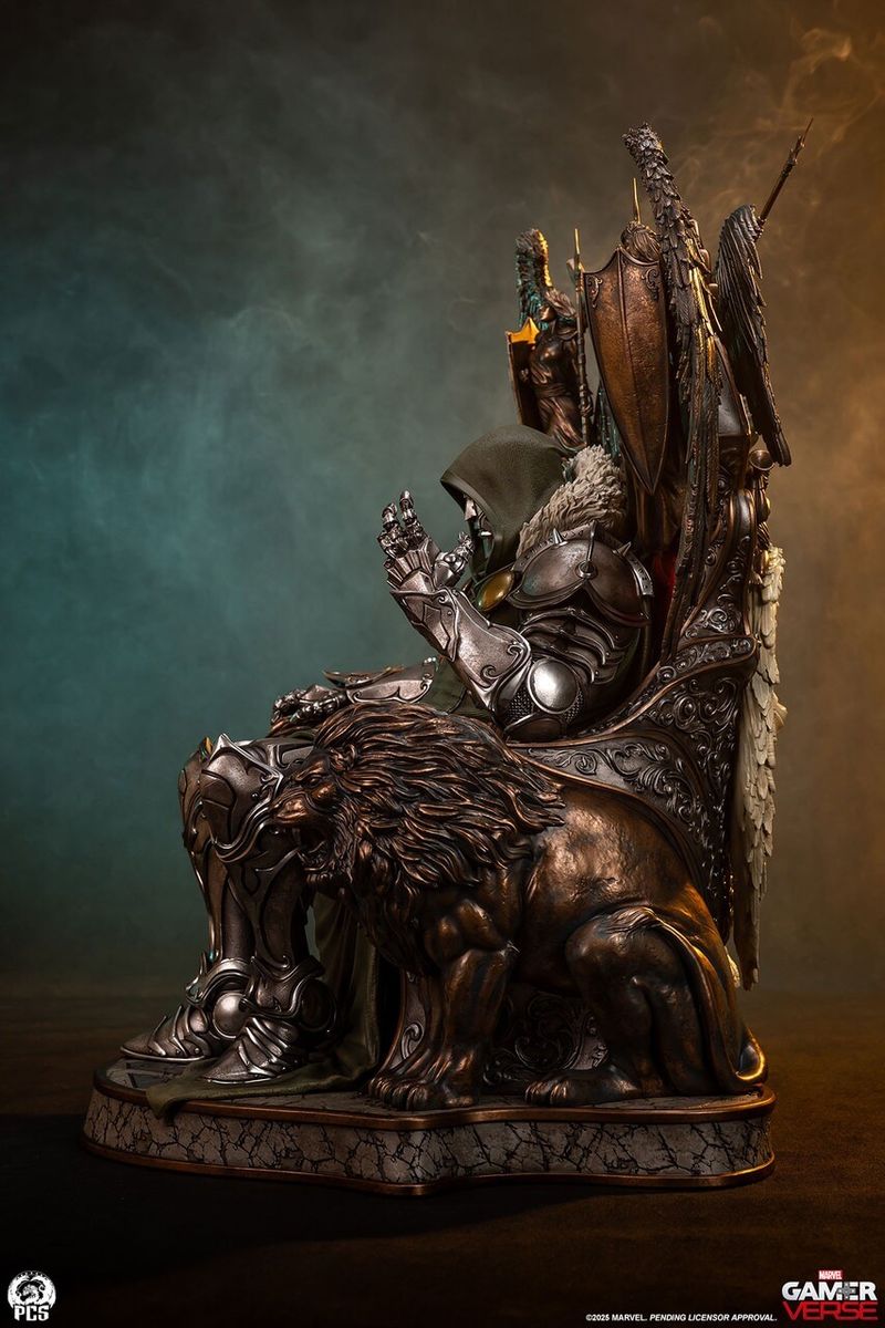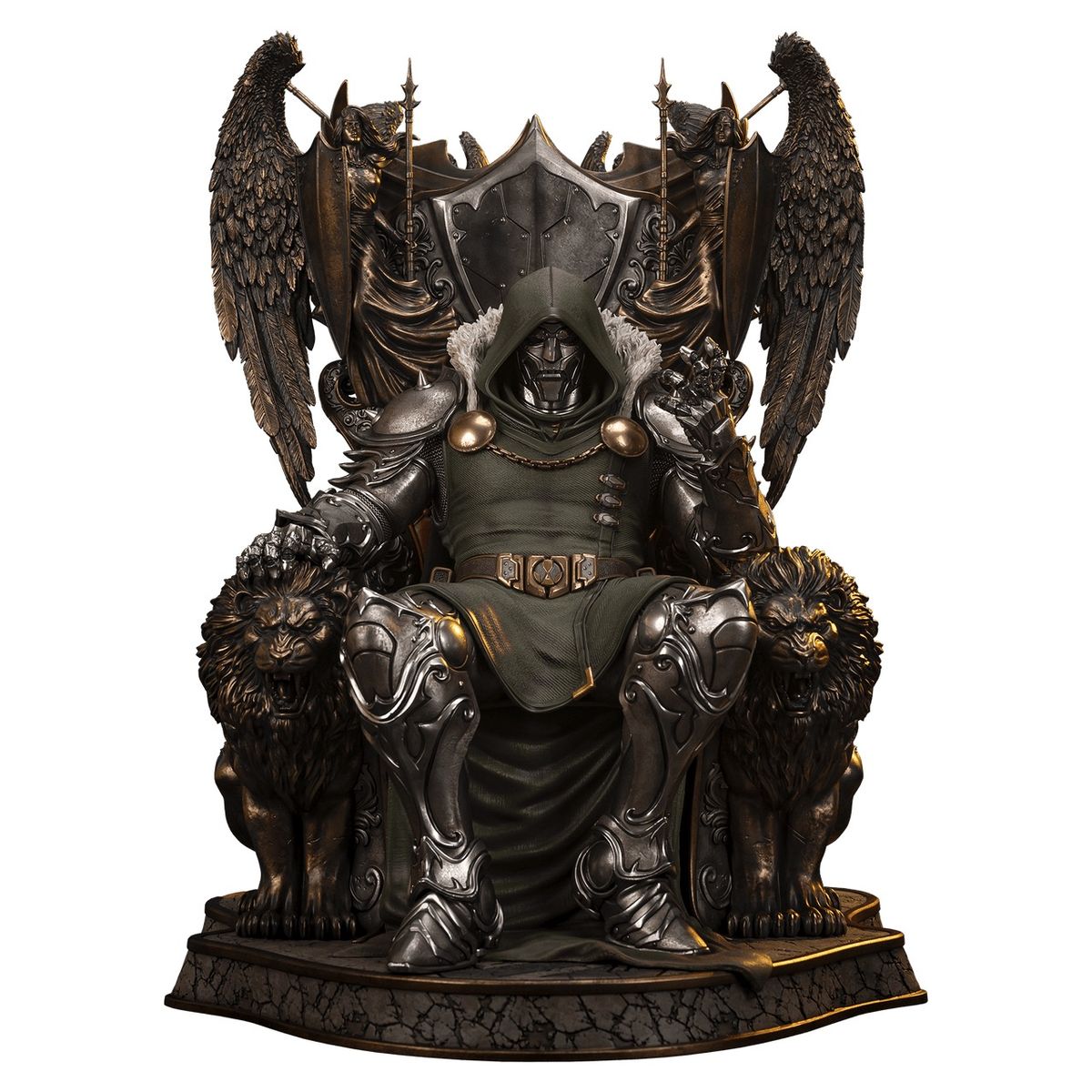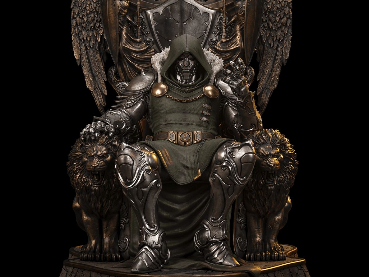 Doom'un oturduğu taht da detaylarla dolu. Metalik hükümdarın her iki yanında bir çift görkemli aslan heykeli bulunurken, arkasında tahtın arkalığını oluşturan, mızrak ve kalkan sallayan bir çift kanatlı savaşçı yer alıyor. Bu unsurlar, koltuğa antik ve uhrevi bir görünüm kazandıran sahte bronz kaplamayla boyanmış. Tahtın arka tarafında, koyu bronz unsurlarla ilginç bir kontrast oluşturan aşınmış taş kaplamalı bir çift figür bulunuyor.