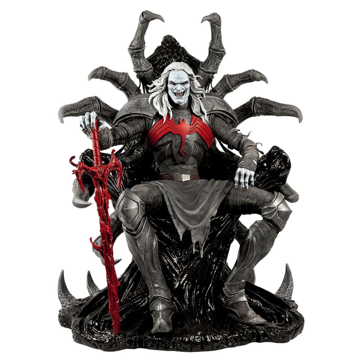 Tamamen yontulmuş bu heykel, etkileyici bir şekilde 83 cm boyunda olup, yıldızlararası tanrıyı, yanında güçlü kırmızı simbiyot kılıcıyla tahtında güvenle otururken tasvir ediyor. Knull, göğüs zırhında canlı kırmızı bir örümcek figürü bulunan koyu renkli bir zırhla donatılmış. Kolları ve bacakları, inanılmaz bir detayla işlenmiş, yırtık pırtık kumaş kayışlarla sarılmış. Tahtı, simbiyotun sıvı formundaki pürüzsüz, camsı dokusuna sahip. Devasa koltuğundan dışarı doğru uzanan ve neredeyse Siyahlı Kral'ı kucaklayan devasa, antik görünümlü örümcek bacakları çıkıntı yapıyor.