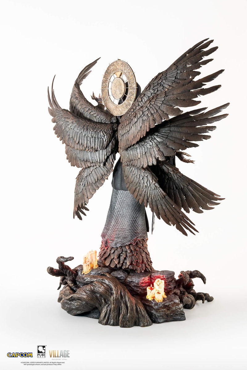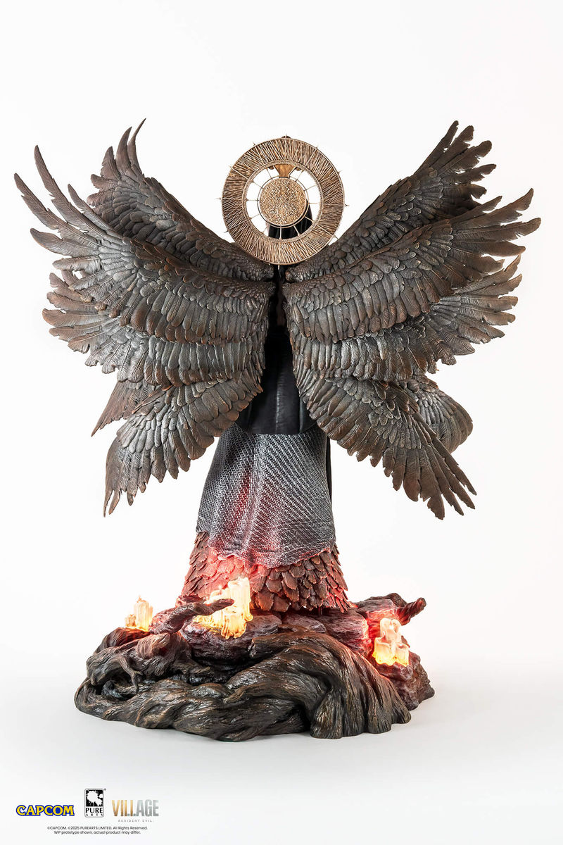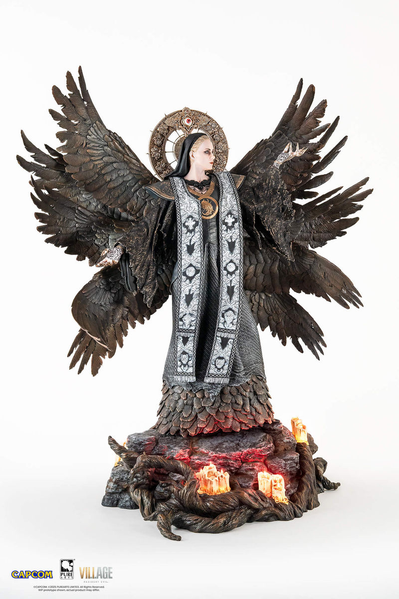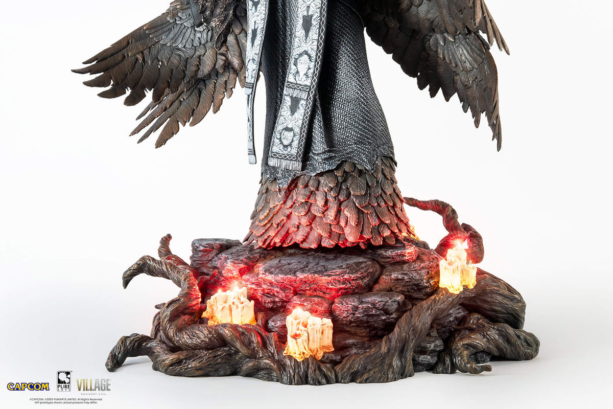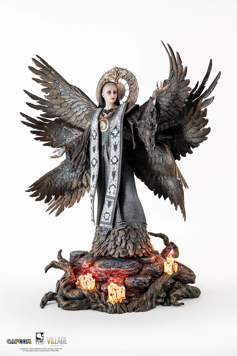 Resident Evil Village'ın tarikat lideri, biyoloğu ve insanüstü kötü adamı inanılmaz derecede yüksek ayrıntılarla yakalanmış! Altı görkemli kanadı da açılmış ve altın halesi ve ustaca şekillendirilmiş elbisesi ilahilik yayıyor. Kendisini enfekte eden The Mold'dan gelen dokunaçlarla tamamlanmış ayrıntılı bir taş zemin tabanının üzerinde zarifçe duran Mother Miranda, altın maskesiyle veya maskesiz olarak sergilenebilir. Ayaklarının dibinde LED ışıklı mumlar titreşiyor ve yaydığı uğursuz auraya katkıda bulunuyor.