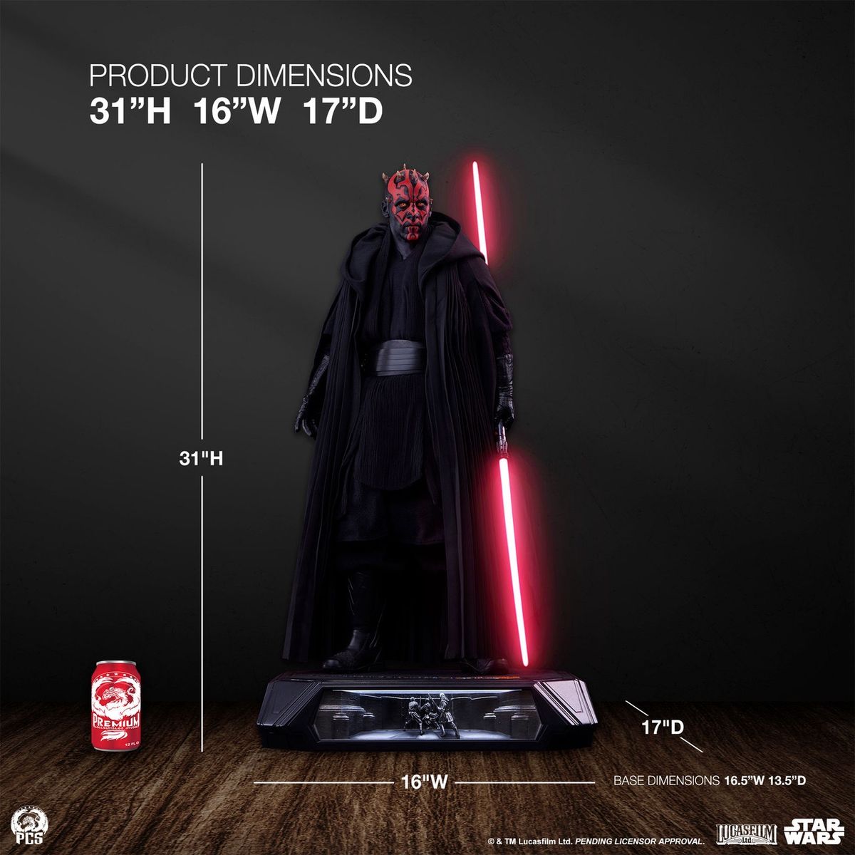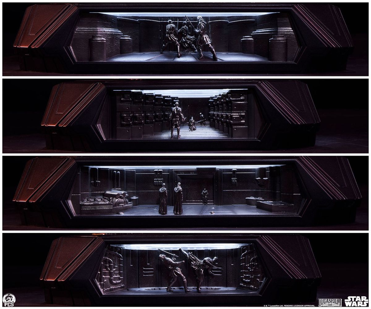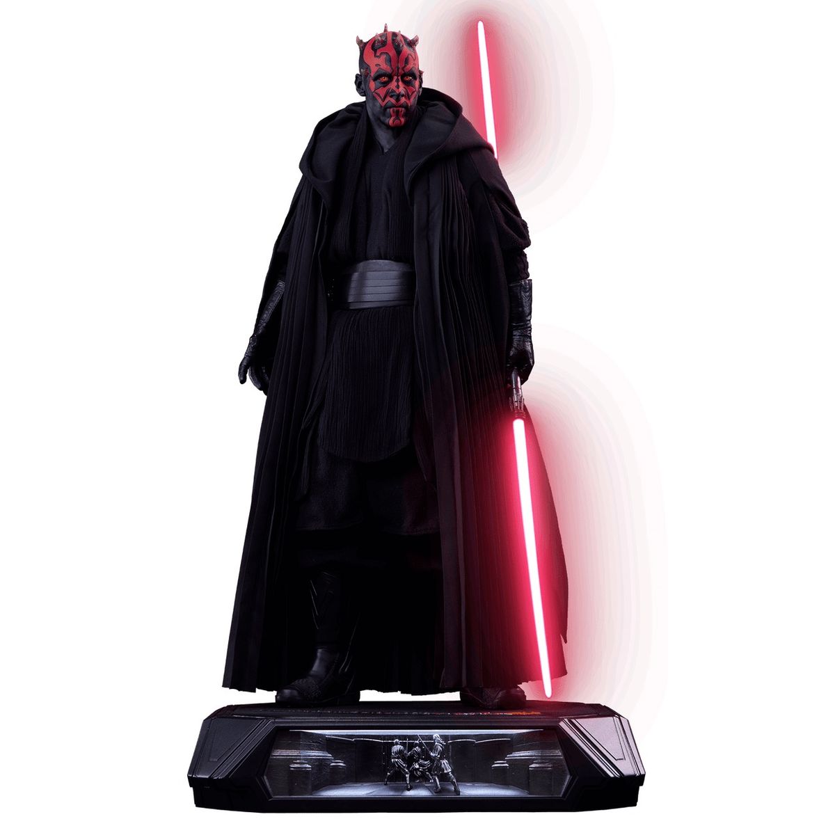 Darth Maul 1:3 heykeli, her biri klasik STAR WARS: THE PHANTOM MENACE™'den önemli sahneleri tasvir eden, etkileyici tepe LED aydınlatmalı dört benzersiz kabartma sahneyle süslenmiş kaide tarzı bir kaide üzerinde duruyor.