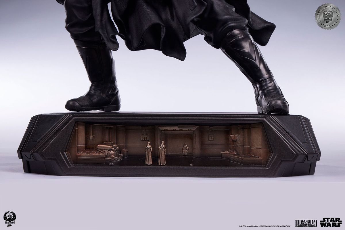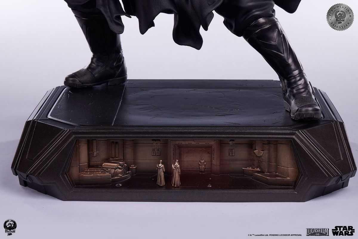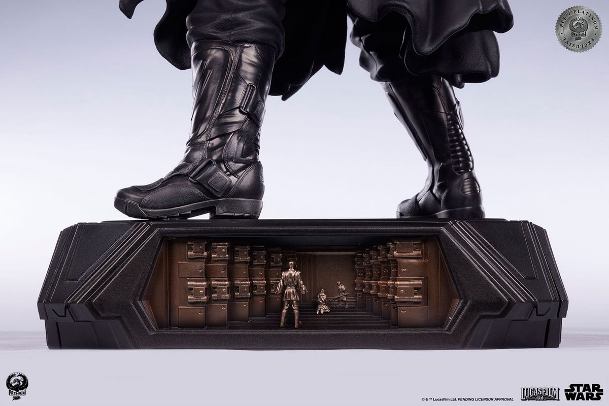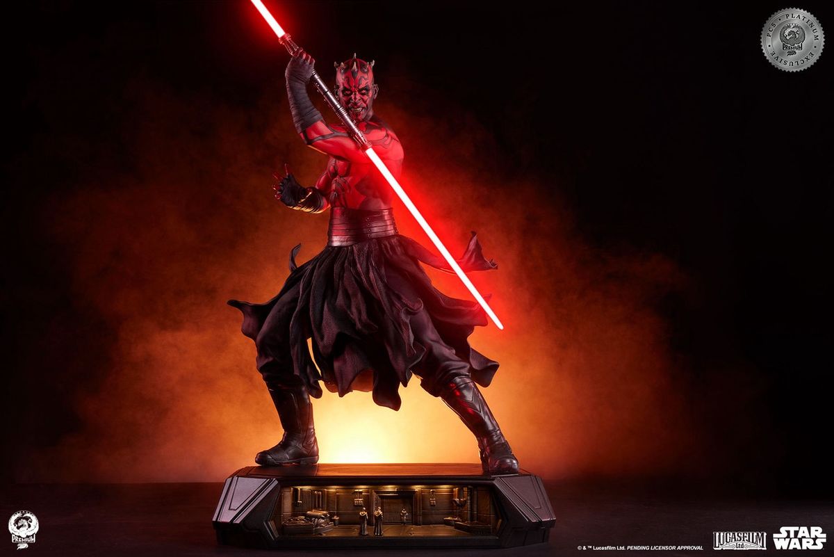 Darth Maul 1:3 heykeli heykelin tepesinde duruyor. Dört benzersiz kabartma sahneyle süslenmiş, etkileyici tepe LED aydınlatmalı kaide tarzı bir taban, her biri klasik STAR WARS: BÖLÜM I - HAYALET TEHLİKESİ'nden önemli sahneleri tasvir ediyor.