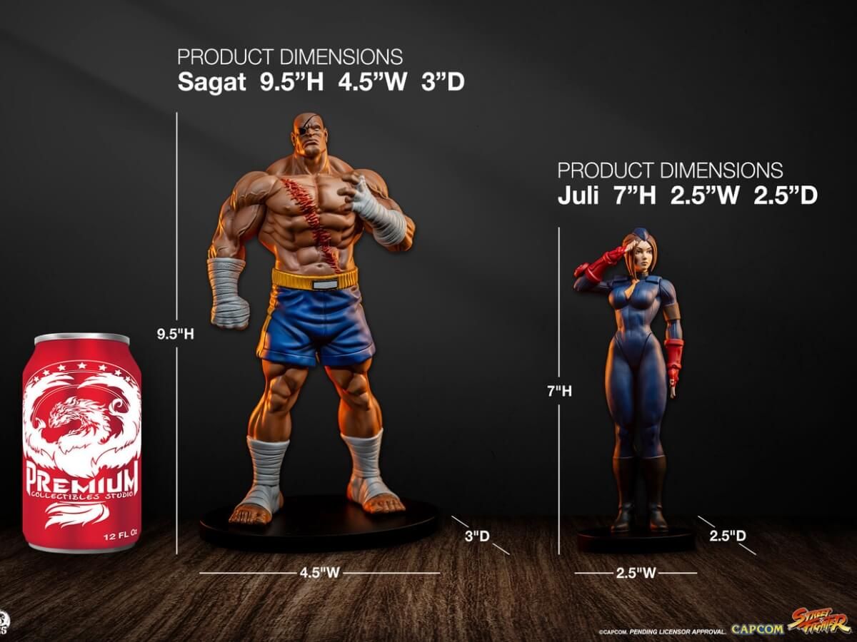 Sagat, Street Fighter turnuvasının en başından beri vazgeçilmez bir figürü olmuştur. Yaralı göğsü ve heybetli duruşu, klasik mavi ve sarı şortu ve el/bacak sargılarıyla Muay Thai dövüşçüsünü tasvir eden bu tamamen boyanmış heykelde canlı bir şekilde hayat buluyor. Juli daha küçük bir dövüşçü olabilir, ancak katı disiplini burada tam olarak sergileniyor. Lacivert bir mayo, sarı kravat ve Shadaloo ajanı için standart olan zırhlı kırmızı eldivenlerle süslenmiş, selam duruşunda duruyor.